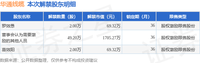 证券之星音讯,依据商场揭露信息收拾,华通线万股限售股份解禁,为公司股权鼓励限售股份,占公司总股本0.1%。(本次数据依据前史公告收拾得出,实在的状况以上市公司最新公告为准)最近一年内,该股累计解禁3.0万股,占总股本的0.01%。本次解禁后,公司还有604.0万股限售股份,占总股本1.18%。详细如下图所示: